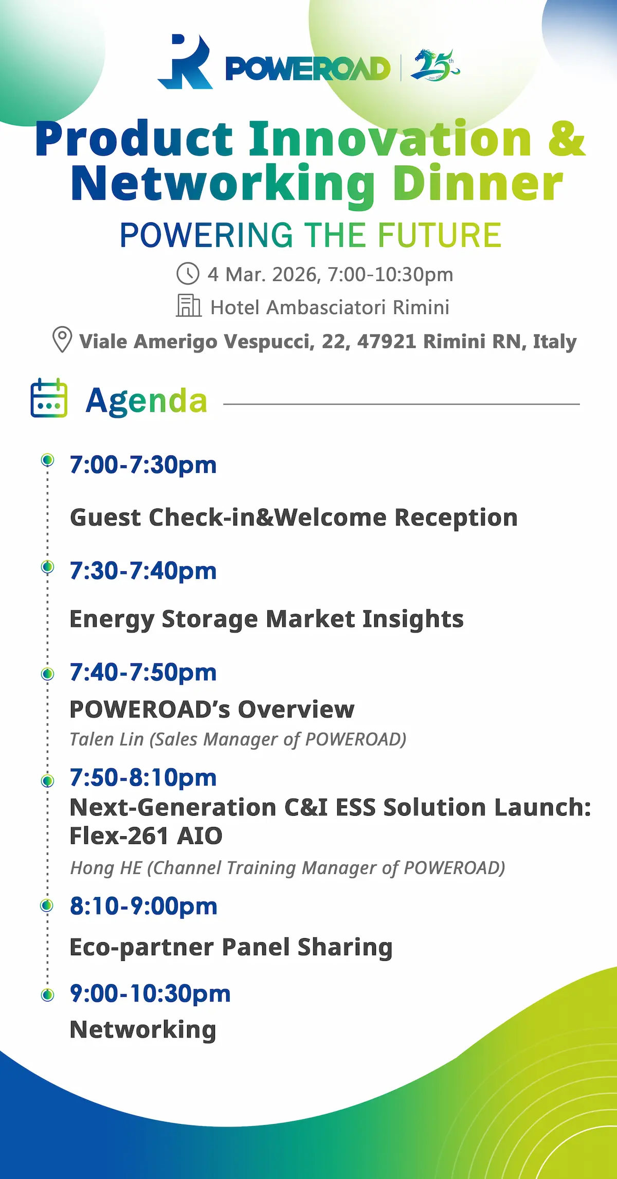 POWEROAD will host a Product Innovation & Networking Dinner on March 4, 2026, from 7:00 PM to 10:30 PM at Hotel Ambasciatori Rimini, Italy.